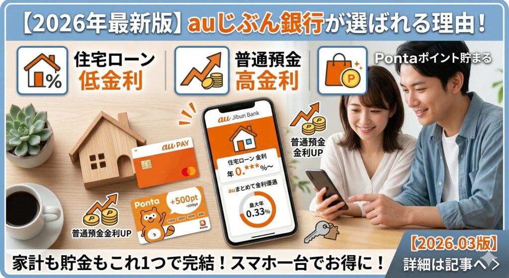 これらに当てはまるなら、auじぶん銀行をメインバンクに据えることで、住宅ローンの負担を減らしつつ、預金金利やポイントで得をする「最強の家計管理」が実現します。
