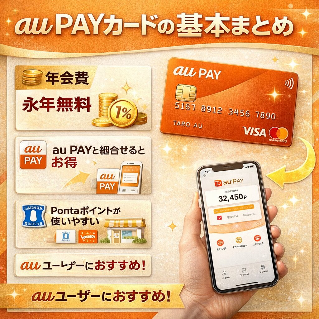スマホ決済のau PAYと連携することで、Pontaポイントが貯まりやすいカードとして人気があります。